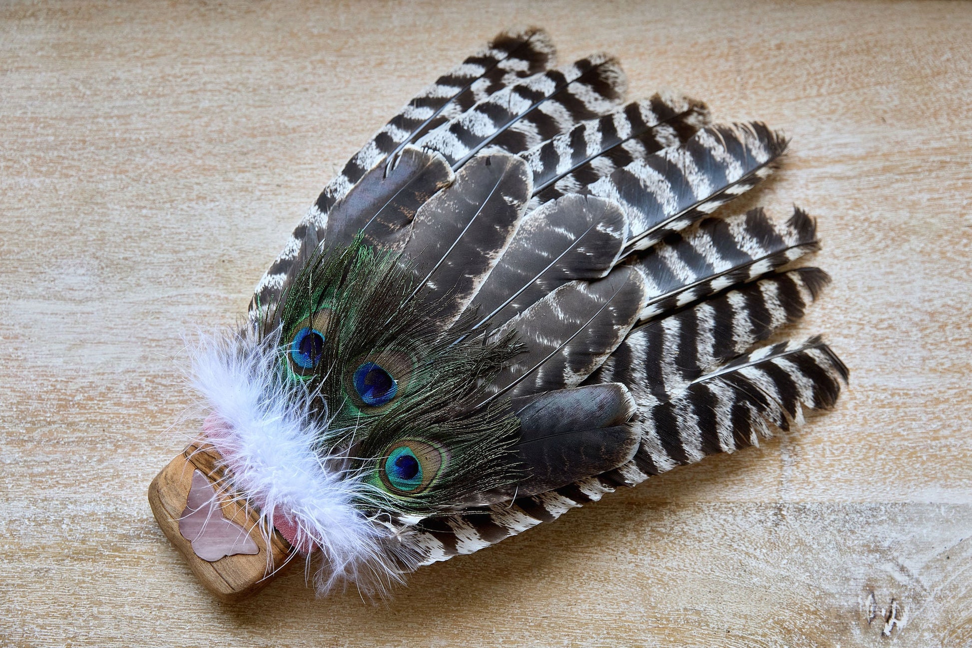 Feather Fan features Turkey wing feathers, a hand carved purpleheart wood handle and an Moonstone inserts
